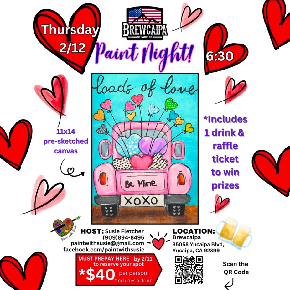 Join us for a Valentine's Day paint night! Scan the QR code or come into Brewcaipa to sign up for this event! $40 includes 1 beer with your paint supplies! Food will be provided with one of our food trucks!
